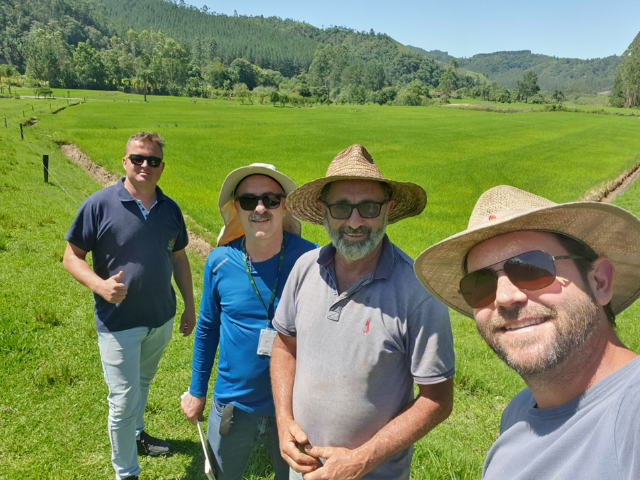Integrantes da equipe Projeto Arroz: Thiago Guesser, extensionista de Rio do Campo, Rubens Marschalek, pesquisador da Estação Experimental de Itajaí, Antônio Carlos Contezini, agricultor, e Ricieri Verdi, extensionista em Pouso Redondo (Foto: Divulgação/Epagri)
