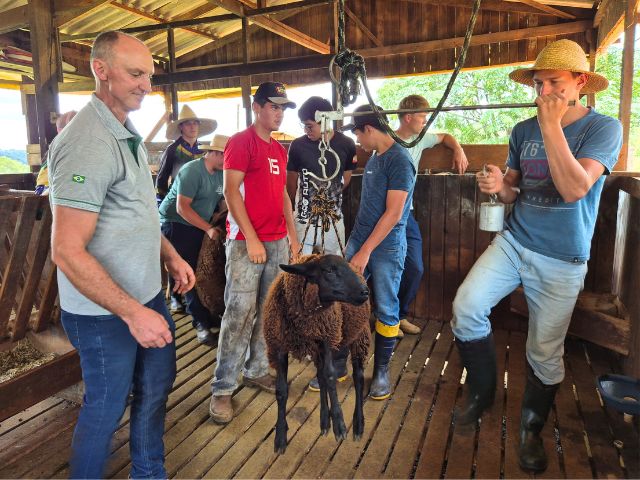 Durante uma das atividades, os alunos aprenderam sobre criação de ovinos e realizaram o manejo dos animais, incluindo pesagem, marcação e registro dos índices zootécnicos (Foto: Helena Moraes/Epagri)