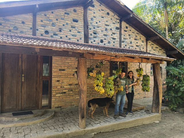 Logo em seguida, em 2020, a pandemia paralisou o mundo. Foi o momento de o casal parar para pensar sobre o que poderia ser feito em época de isolamento social. E não tiveram dúvida: construir a própria casa, com material de demolição e recicláveis, como garrafas de vidro, utilizadas como luminárias na parede, feita com tijolos reaproveitados de uma antiga estufa de secar fumo. Até a tinta foi feita de barro. A casa ficou pronta em dois anos.