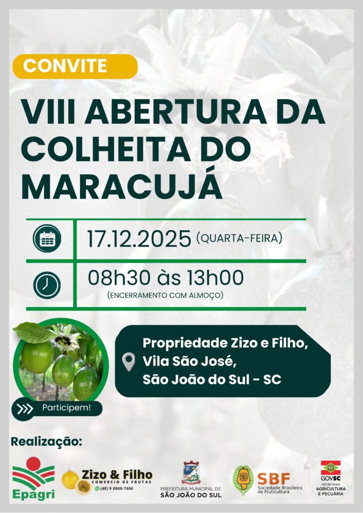 A Epagri realiza no dia 17 de dezembro, das 8h30min às 13h, a abertura da colheita do maracujá no município de São João do Sul. As edições são itinerantes, cada ano em uma cidade e propriedade diferente. Desta vez, os anfitriões são os donos da Zizo e Filho, na propriedade localizada no bairro Vila São José.