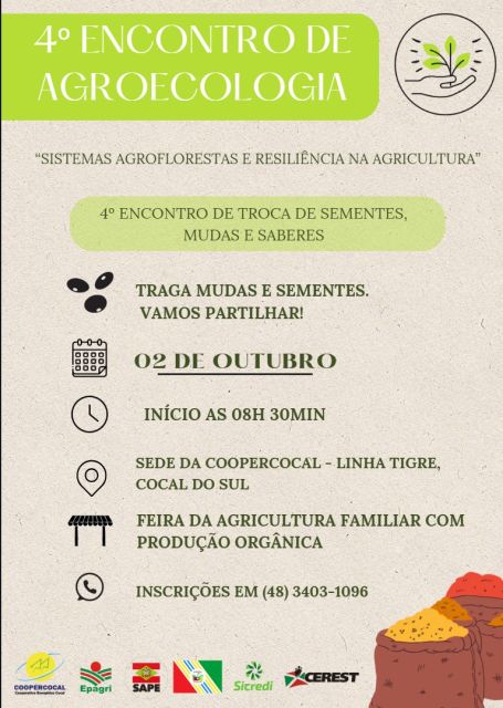 O encontro também contará com uma apresentação cultural do Coral de Vozes do Bairro da Juventude, um almoço festivo e, no período da tarde, a tradicional troca de sementes, mudas e saberes, momento que fortalece a biodiversidade e incentiva a preservação ambiental. O evento é uma realização em parceria entre Epagri, Prefeitura de Cocal do Sul, Coopercocal, Secretaria de Estado da Agricultura e Pecuária, Sicredi e Cerest.
