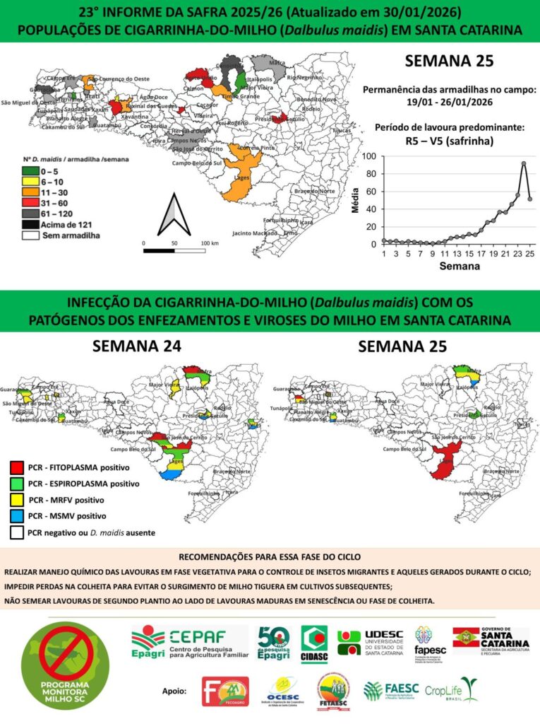 O programa Monitora Milho SC coleta e divulga semanalmente informações levantadas em 55 lavouras distribuídas em todo o Estado de Santa Catarina, permitindo que o setor produtivo acompanhe a evolução da população de cigarrinhas e as infecções causadas por esses insetos.