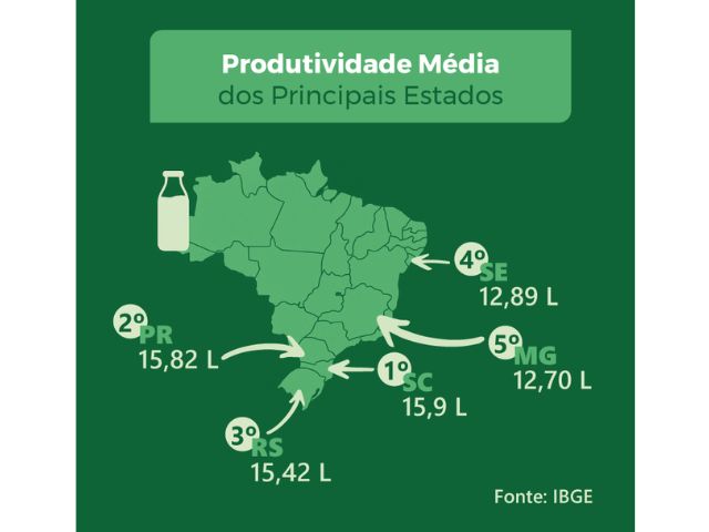 O Estado também se destaca pela eficiência produtiva. Apesar de uma redução de 2% do efetivo de vacas ordenhadas, Santa Catarina alcançou a maior produtividade média do país, de 15,9 litros por vaca/dia, um aumento de 47% na última década.